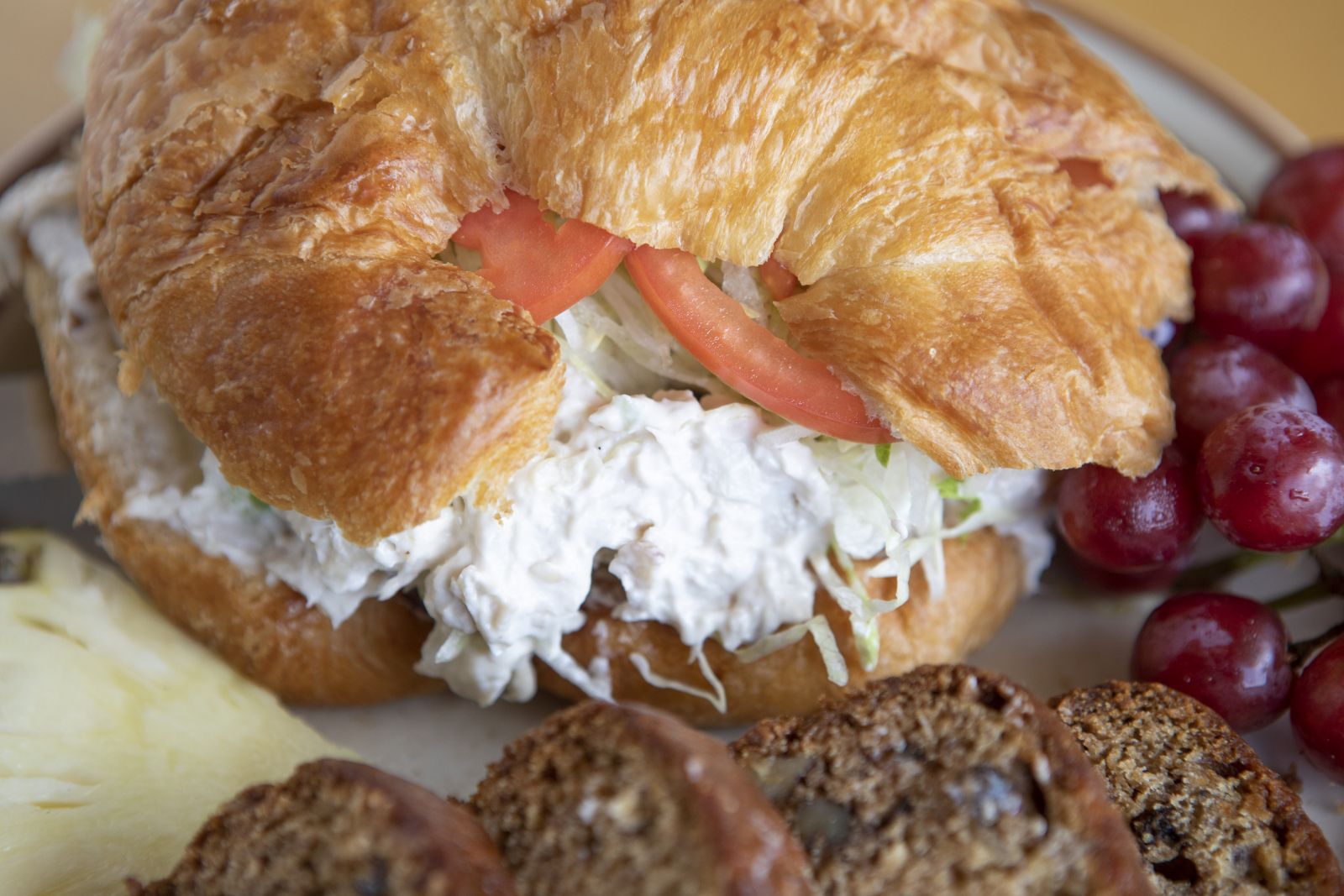A croissant filled with delicious chicken salad and topped with shredded lettuce and tomatoes.