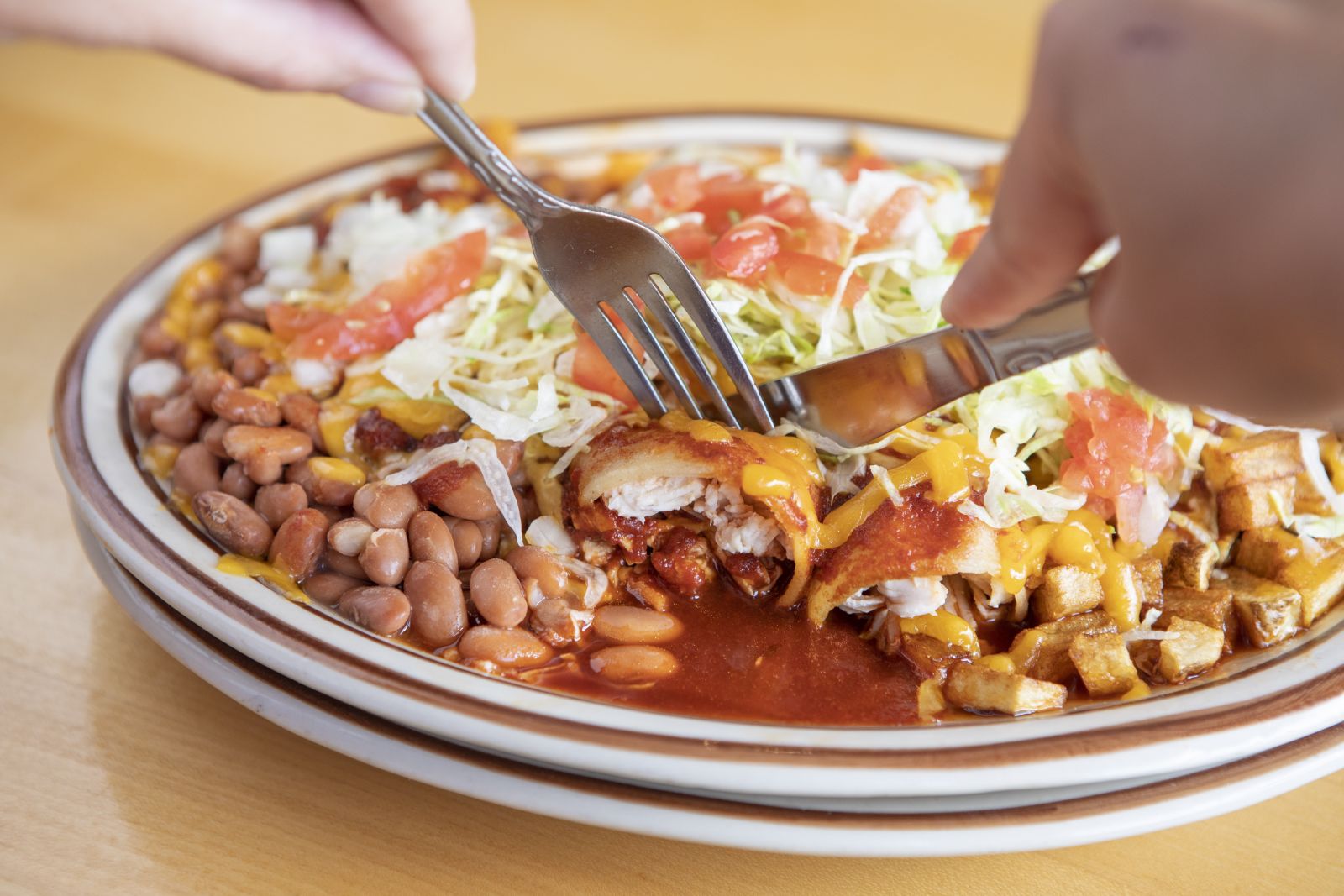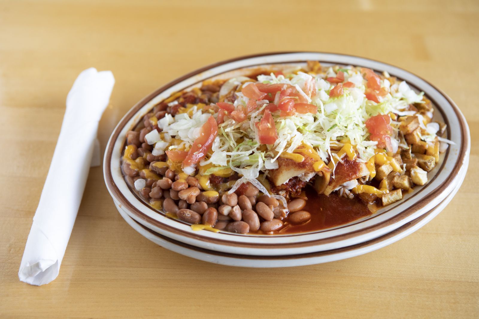 Your choice of cheese or chicken, smothered with red or green chile. Served with papitas and beans. Topped with lettuce, tomatoes, and onions.
