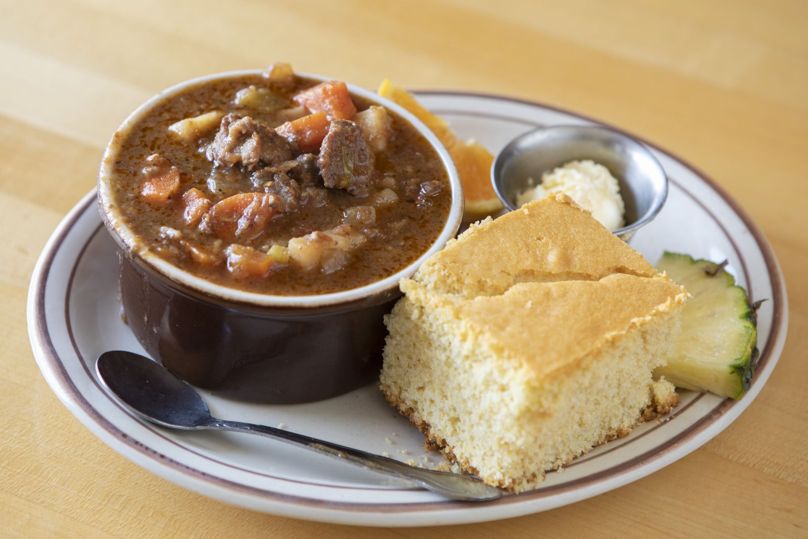 A bowl of soup from the heart with honey cornbread and honey butter.
