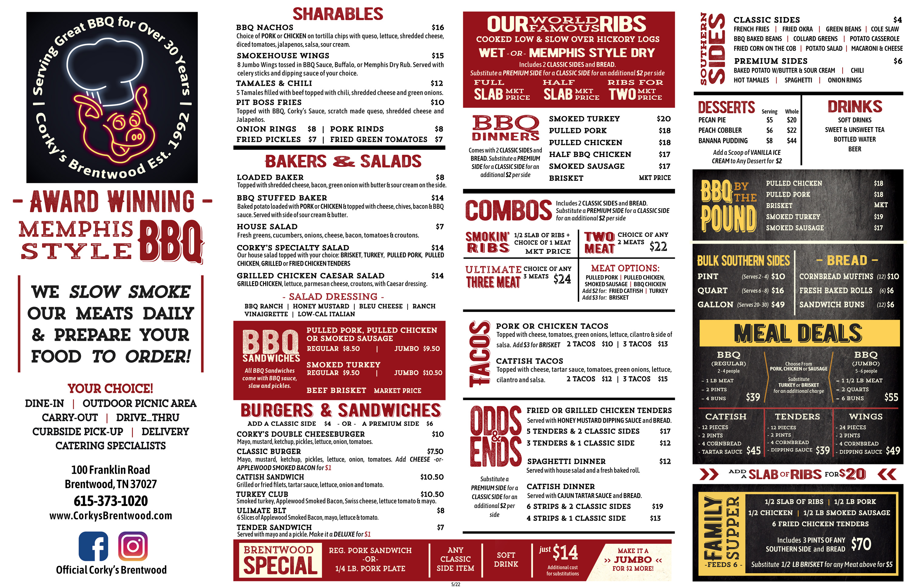 Topped with BBQ, Corky’s Sauce, scratch made queso, shredded cheese and jalapeños.